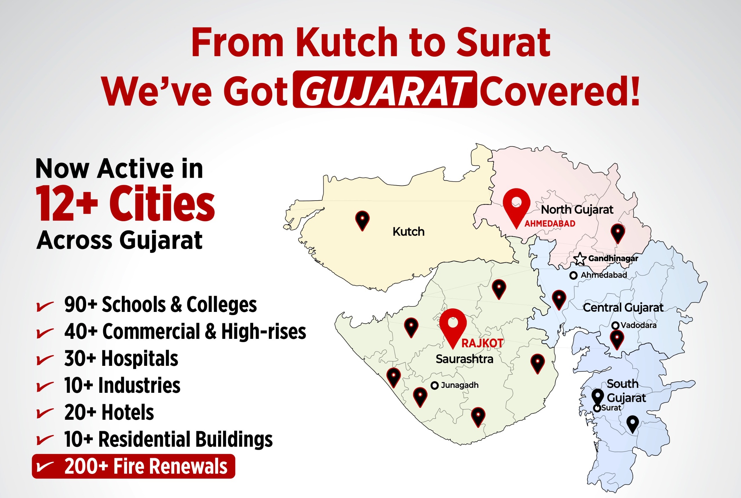 Delta Fire Services delivers expert fire safety and protection services throughout Gujarat. From designing fire protection systems to securing Fire NOC certifications, we handle every aspect with professionalism and regulatory compliance.